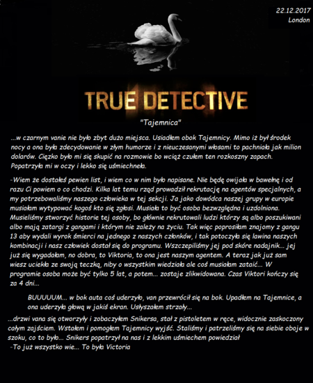 Księżniczka z lodu poniedziałek 4 grudzień 2017 rok. Do biura Detektywów otrzymaliśmy prośbę o pomoc. Treść była szokująca. "Na serwerze Luzownia DD2 pojawiła się Księżniczka z lodu która z zimną krwią morduje bezbronnych. Czai się za skrzynkami i bez mrugnięcia okiem pociąga za spust" Postanowiliśmy działać. Ktoś musi powstrzymać tę bezlitosną morderczynie. Do akcji wyruszyli nasi najlepsi ludzie. Po niecałych dwóch godzinach otrzymałem raport Raport: z tego co ustaliliśmy prawdopodobnie morderczynią jest na pewno kobieta, wiek nieokreślony, rysopis niemożliwy do określenia ze względu na kominiarkę, na szczęście podsłuchałem rozmowę, rozmawiała przez telefon... To co usłyszałem wprawiło mnie w osłupienie, musimy ją powstrzymać! Treści rozmowy nie mogę przytoczyć całej ponieważ były tam bardzo drastyczne szczegóły, ale ONA postanowiła że będzie zabijać bez listości, zabije każdego kto stanie jej na drodze aby zostać numerem 1 płatnych zabójców, i na koniec powiedziała, że ONA jest najlepsze, taka jak ONA jest tylko jedna, powiedziała, powiedziała że TAJEMNICA zawsze wygrywa ! Ogłoszenie! Każdy kto może pomóc w zlikwidowaniu celu prosimy o strzelanie prosto między oczy ! To jest bezwzględna terrorystka! Za pomoc czekają nagrody !