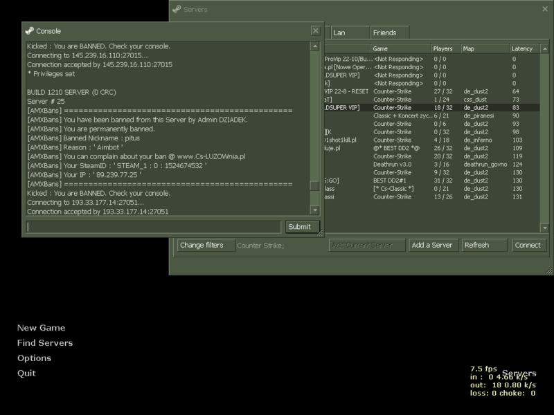NICK: DYZiO MAPA: de_dust2 DATA: 08.04.2018 POWÓD: Wstaw SS KOMENTARZ: a demko masz jakieś adminie ? LINK DO BANA: WYCINEK Z KONSOLI: [AMXBans] =============================================== [AMXBans] You have been banned from this Server by Admin KaYmAn. [AMXBans] You are permanently banned. [AMXBans] Banned Nickname : DYZiO [AMXBans] Reason : ' Wstaw 5 screenow na CS-LUZownia ' [AMXBans] You can complain about your ban @ www.Cs-LUZOWnia.pl [AMXBans] Your SteamID : ' STEAM_0 : 0 : 33594427 ' [AMXBans] Your IP : ' 31.11.128.162 ' [AMXBans] =============================================== Kicked : You are BANNED. Check your console. SS